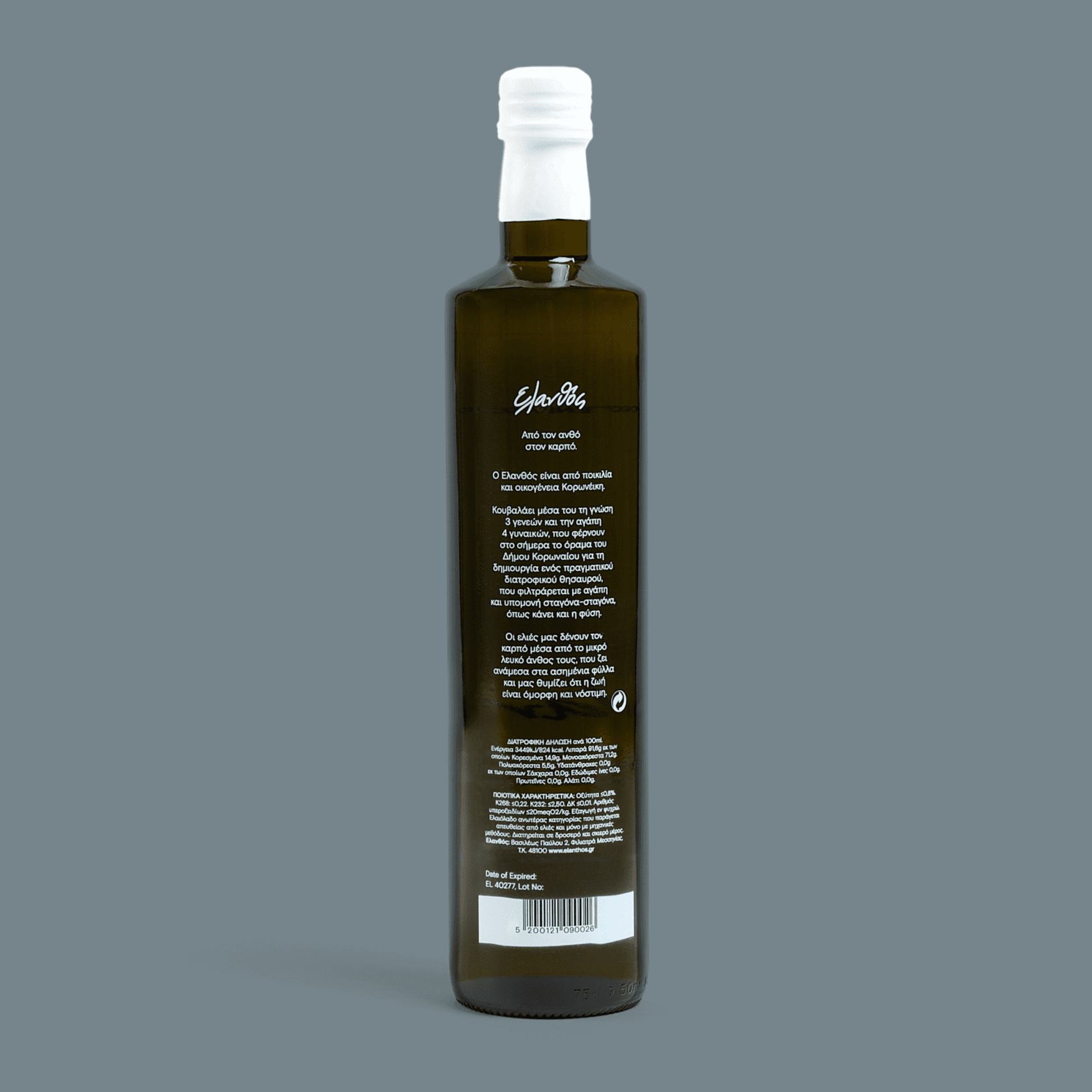 From the blossom to the fruit. Elanthós is made from the Koroneiki olive variety. It contains the knowledge of 3 generations and the passion of 4 women, who have now carried Dimos Koronaios’ vision to the present day: to create a genuine nutritional treasure, filtered drop by drop with love and patience, just the way nature does it.Our olives bear their fruit through their small white blossoms, which live among the silvery leaves and remind us that life can be beautiful—and delicious!