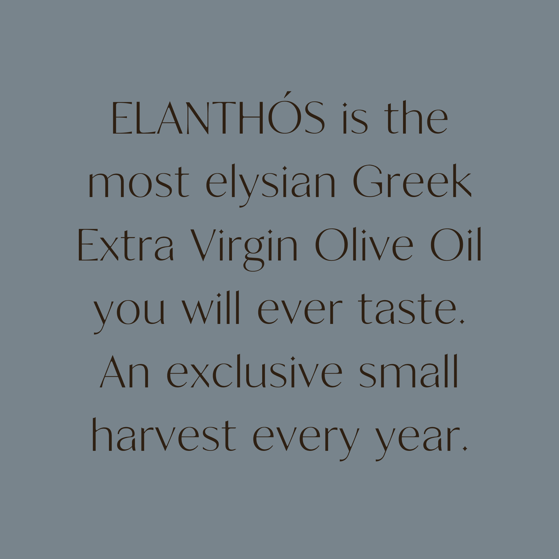 The most epicurean Greek Extra Virgin Olive Oil. From the blossom to the fruit. Elanthós is made from the Koroneiki olive variety.